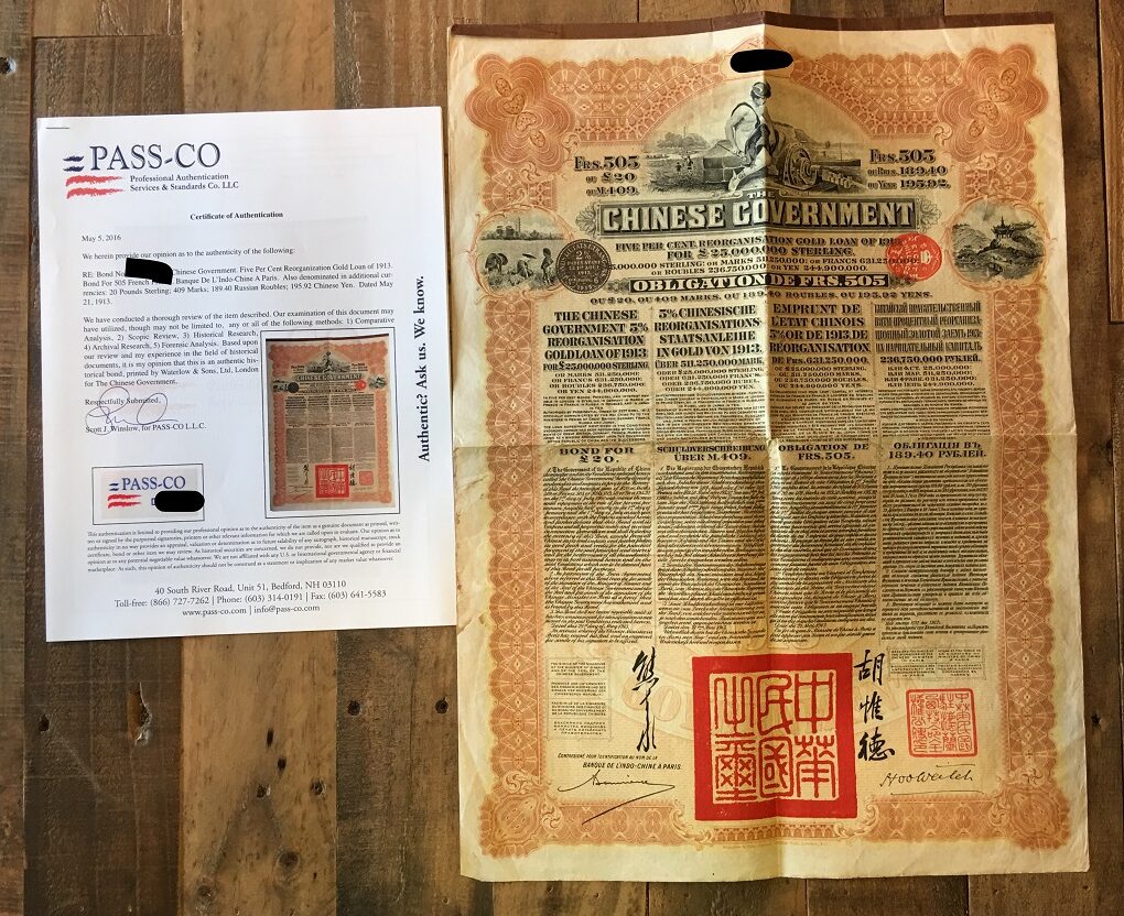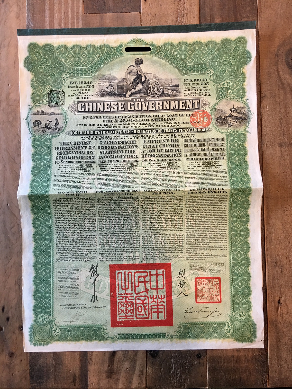 The 1913 Reorganisation Gold Loan bonds are visually striking, featuring bilingual text in English, Chinese, and French, printed by Waterlow & Sons with elaborate engravings and symbolic vignettes representing China’s modernization and its partnership with global finance.